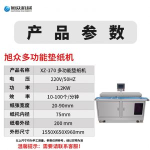 XZ-170多功能墊紙機,適用于大規(guī)模生產多功能墊紙機適用于包子、饅頭、豆包等需要墊包紙的食。伺服控制、墊紙長度可調整。高效墊紙告別人工旭眾牌ⅩZ-170多功能墊紙機適用于規(guī)模生產的食品企業(yè)制作包子機、饅頭等食品的自動墊包紙設備。