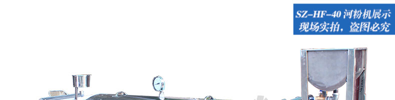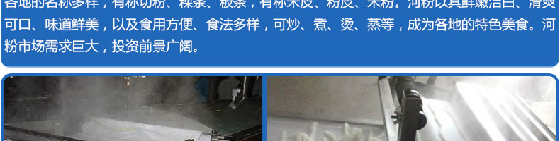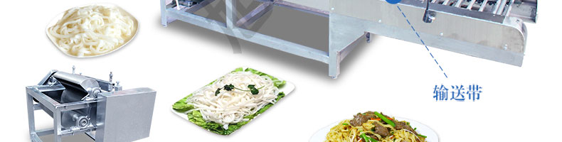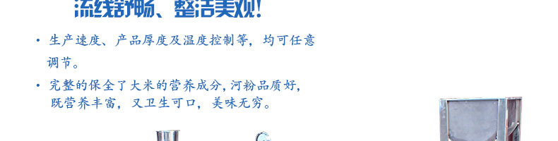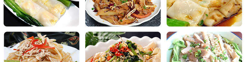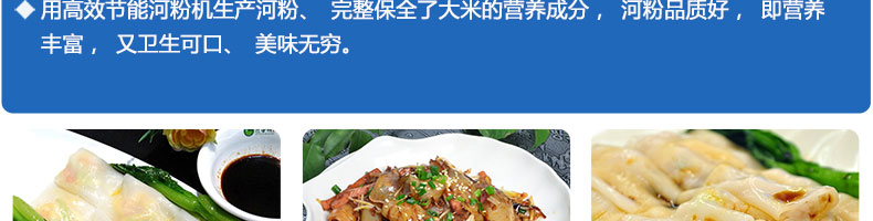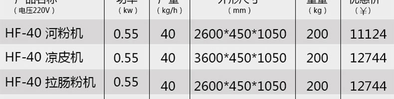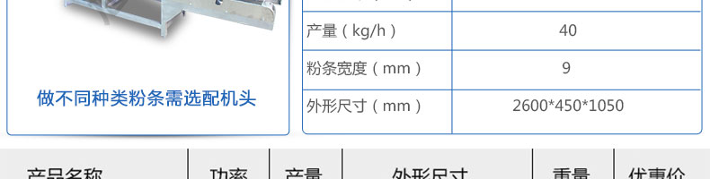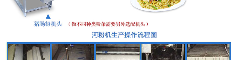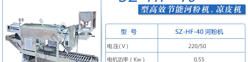 名稱SZ-HF-40高效節能河粉機 電源220/380V 功率0.75/19kw 產量16/24/32/40kg/h 尺寸主機尺寸2600*450*1050mm 外形尺寸2700*650*1500mm 重量200kg 規格粉條寬度mm:4/6/8/10 其他