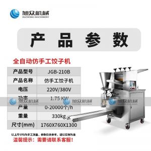 名稱JGB-210B仿手工餃子機 電源220/380v 功率1.75kw 產量0-20000個/h 尺寸1760*760*1300mm 重量330kg 規格15-35g/個 其他