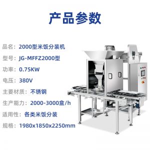 名稱米飯分裝機 電源380V 功率0.75KW 產量2000-3000盒/h 尺寸1980X1850X2250mm 重量請咨詢銷售員 規格請咨詢銷售員 其他