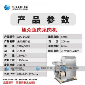名稱XZC-160型魚肉采肉機 電源220/380V 功率2.2KW 產量聯(lián)系銷售員 尺寸830X680X870mm 重量140kg 規(guī)格聯(lián)系銷售員 其他